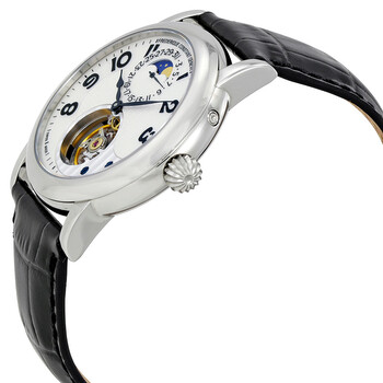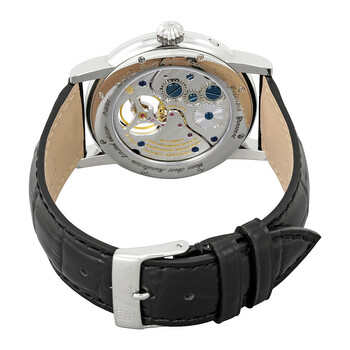 Silver-tone stainless steel case with a black leather strap. Fixed silver-tone stainless steel bezel. Silver with a skeletal window dial with blue spade-shaped hands and Arabic numeral hour markers. Minute markers around the outer rim. Dial Type: Analog. Date display at the 12 o'clock position. Two sub-dials displaying: moonphase/date and open heart. Frederique Constant Calibre FC-915 Automatic movement, containing 17 Jewels, composed of 102 parts, bitting at 28800 vph, and has a power reserve of approximately 42 hours. Scratch resistant sapphire crystal. Pull / push crown. Skeleton transparent exhibition see through case back. Round case shape, case size: 41 mm, case thickness: 9.7 mm. Tang clasp. Water resistant at 50 meters / 165 feet. Functions: date, hour, minute, moonphase. Heart Beat Series. Dress watch style. Watch label: Swiss Made. Frederique Constant Heart Beat Silver Dial Men's Watch FC-915AS4H6.