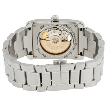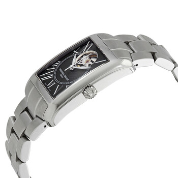 Silver-tone stainless steel case with a silver-tone stainless steel bracelet. Fixed silver-tone stainless steel bezel. Black (heart beat) dial with silver-tone hands and Roman numeral hour markers. Minute markers around an inner ring. Dial Type: Analog. Luminescent hands. Frederique Constant Calibre FC-310 Automatic movement, based upon ETA 2824-2, containing 26 Jewels, bitting at 28800 vph, and has a power reserve of approximately 38 hours. Scratch resistant sapphire crystal. Pull / push crown. Transparent case back. Rectangle case shape, case size: 33.3 mm x 30.4 mm, case thickness: 10.5 mm. Band width: 20 mm. Fold over clasp. Water resistant at 30 meters / 100 feet. Functions: hour, minute, second. Dress watch style. Watch label: Swiss Made. Frederique Constant Heartbeat Automatic Black Dial Ladies Watch FC-310MB4S36B.