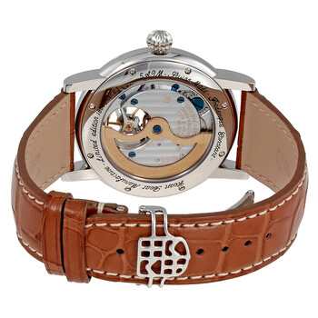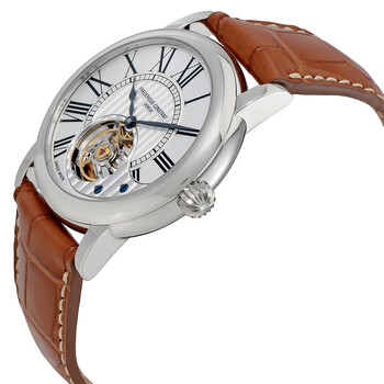 Silver-tone stainless steel case with a brown leather strap. Fixed silver-tone stainless steel bezel. Silver (skeletal display) dial with black spade-shaped hands and Roman numeral hour markers. Minute markers around an inner ring. Dial Type: Analog. Frederique Constant Calibre FC-930 automatic movement with a 42-hour power reserve. Scratch resistant sapphire crystal. Pull / push crown. Transparent case back. Round case shape, case size: 42 mm, case thickness: 10 mm. Band width: 20 mm. Tang clasp. Water resistant at 50 meters / 165 feet. Functions: hour, minute,. Luxury watch style. Watch label: Swiss Made. Frederique Constant Heat Beat Automatic Men's Watch 930MS4H6.