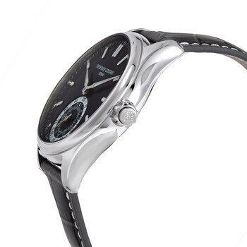 Stainless steel case with a grey leather strap. Fixed stainless steel bezel. Black dial with luminous silver-tone arrow-shaped hands and index hour markers. Minute markers around the inner rim. Dial Type: Analog. Luminescent hands and markers. Date display at the 6 o'clock position. Dual sub-dial displaying: 1/100th second and date. Frederique Constant Calibre MMT-285 quartz movement. Scratch resistant sapphire crystal. Pull / push crown. Solid case back. Round case shape. Case size: 42 mm. Case thickness: 13.35 mm. Band width: 21 mm. Fold over clasp with a push button release. Water resistant at 50 meters / 165 feet. Functions: date, hour, minute, second, activity tracking, sleep monitoring, calls (fc-281 notify models only), texts (fc-281 notify models only), dynamic coaching, sleep cycle alarms, get active alerts, worldtimer, cloud backup & restore. Smart watch style. Watch label: Swiss Made. Frederique Constant Horological Quartz Black Dial Men's Smart Watch FC-285BW5B6.