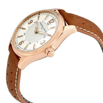 Rose gold ion-plated stainless steel case with a brown (calfskin) leather strap. Fixed rose gold ion-plated bezel. Silver dial with luminous rose gold-tone alpha-style hands and index hour markers. Arabic numerals mark the 3, 6, 9 and 12 o'clock positions. 1/100th markers. Minute markers around the outer rim. Dial Type: Analog. Luminescent hands. Frederique Constant calibre MMT-282 quartz movement. Scratch resistant sapphire crystal. Solid case back. Round case shape. Case size: 42 mm. Case thickness: 14 mm. Band width: 21 mm. Tang clasp. Water resistant at 50 meters / 165 feet. Functions: hour, minute, sleep monitoring, sleep cycle alarms, get-active alerts, cloud backup and restore, GMT, call and message notifications. Additional Info: in general, suitable for short periods of recreational swimming, but not diving or snorkeling. Smart watch style. Watch label: Swiss Made. Frederique Constant Horological Silver Dial Men's Smart Watch FC-282AS5B4.