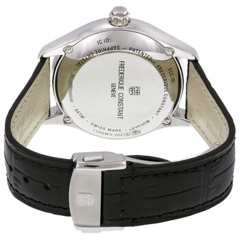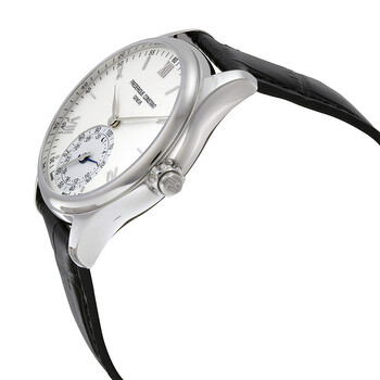 Stainless steel case with a black alligator leather strap. Fixed stainless steel bezel. Silver dial with silver-tone hands and alternating index and Roman numeral hour markers. Minute markers around the outer rim. Dial Type: Analog. Date. A combination date and 1/100th second sub-dial. Quartz movement. Scratch resistant sapphire crystal. Solid case back. Case size: 42 mm. Case thickness: 13.35 mm. Round case shape. Band width: 20 mm. Fold over deployment clasp. Water resistant at 50 meters / 165 feet. Functions: date, hour, minute, second. Luxury watch style. Watch label: Swiss Made. Item Variations: FC 285S5B6, FC.285S5B6, FC285S5B6. Frederique Constant Horological Smart Watch Men's Watch FC-285S5B6.