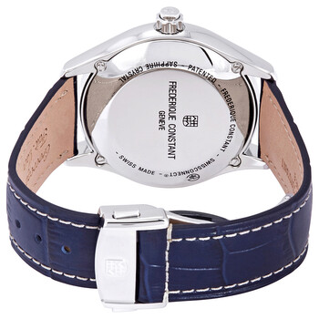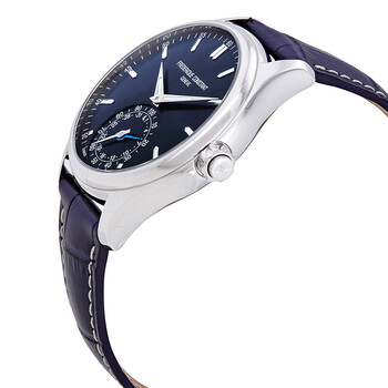 Stainless steel case with a blue leather strap. Fixed stainless steel bezel. Blue dial with luminous silver-tone dauphine-style hands and index hour markers. Minute markers around the outer rim. Dial Type: Analog. Luminescent hands. Date display at the 6 o'clock position. Combination: date/ 1/100th of a second sub-dial. Frederique Constant calibre MMT-285 quartz movement. Scratch resistant sapphire crystal. Screw down crown. Solid case back. Round case shape. Case size: 42 mm. Case thickness: 13.35 mm. Band width: 22 mm. Fold over clasp with a push button release. Water resistant at 50 meters / 165 feet. Functions: date, day, hour, minute. Smart watch style. Watch label: Swiss Made. Frederique Constant Horological Smartwatch Blue Dial Men's Watch FC-285NS5B6.