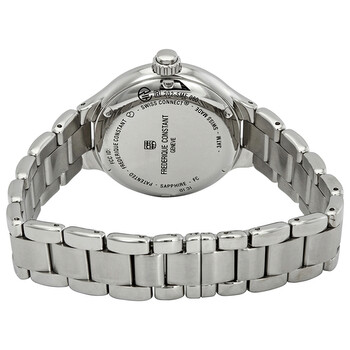 Stainless steel case with a stainless steel bracelet. Fixed stainless steel bezel. White mother of pearl dial with luminous silver-tone hands and index hour markers. Roman numerals mrk the 3, 6, 9 and 12 o'clock positions. Minute markers around the outer rim. Dial Type: Analog. Luminescent hands and markers. Frederique Constant calibre MMT-281 quartz movement. Scratch resistant sapphire crystal. Pull / push crown. Solid case back. Round case shape. Case size: 34 mm. Case thickness: 11.04 mm. Band width: 15.3 mm. Fold over clasp. Water resistant at 30 meters / 100 feet. Functions: date, hour, minute, call notifications, sleep monitoring, activity tracking, and text notifications. Horological Smartwatch Series. Smart watch style. Watch label: Swiss Made. Frederique Constant Horological White Mother of Pearl Dial Ladies Smartwatch FC-281WH3ER6B.