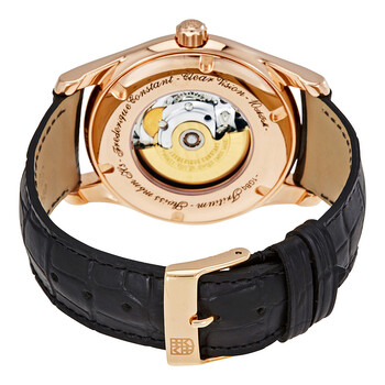 Rose gold-tone stainless steel case with a black leather strap. Fixed rose gold-tone bezel. Black dial with luminous rose gold-tone hands and stick hour markers. Minute markers around the outer rim. Dial Type: Analog. Luminescent hands and markers. Date display at the 3 o'clock position. Frederique Constant calibre FC-303 automatic movement with a 42-hour power reserve. Scratch resistant sapphire crystal. Pull / push crown. Skeleton case back. Case size: 43 mm. Case thickness: 11 mm. Round case shape. Band width: 23 mm. Band length: 8 inches. Tang clasp. Water resistant at 100 meters / 330 feet. Functions: date, hour, minute, second. Additional Info: suitable for swimming and shallow snorkeling; unsuitable for diving). Dress watch style. Watch label: Swiss Made. Item Variations: FC 303G6B4, FC.303G6B4, FC303G6B4. Frederique Constant Index Black Dial Automatic Men's Watch 303G6B4.