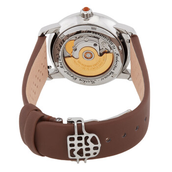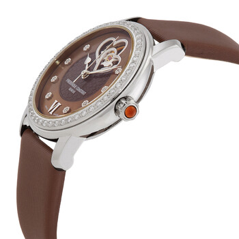 Silver-tone stainless steel case with a chocolate satin strap. Fixed silver-tone stainless steel set with diamonds bezel. Chocolate (double heart cut-out) dial with silver-tone hands and diamond hour markers. Roman numeral appears at the 6 o'clock position. Dial Type: Analog. Frederique Constant Calibre FC-310 Automatic movement, based upon ETA 2824-2, containing 26 Jewels, bitting at 28800 vph, and has a power reserve of approximately 38 hours. Scratch resistant sapphire crystal. Transparent case back. Round case shape, case size: 34 mm, case thickness: 10 mm. Fold over clasp. Water resistant at 60 meters / 200 feet. Functions: hour, minute, second. Love Heart Beat Series. Dress watch style. Watch label: Swiss Made. Frederique Constant Love Heart Beat Automatic Diamond Ladies Watch 310CDHB2PD6.