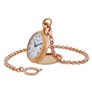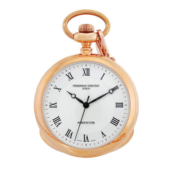 Rose gold stainless steel case with a chain band. Fixed bezel. Silver dial with black hands and index hour markers. Minute markers around the outer rim. Dial Type: Analog. Frederique Constant Calibre FC-700HW hand wind movement with a 42-hour power reserve. Scratch resistant sapphire crystal. Pull / push crown. Solid case back. Round case shape. Case size: 45 mm. Water resistant at 30 meters / 100 feet. Functions: hour, minute, second. Luxury watch style. Watch label: Swiss Made. Item Variations: FC 700MC6PW4, FC.700MC6PW4, FC700MC6PW4. Frederique Constant Manufacture Silver Dial Rose Gold Stainless Steel Pocket Watch FC-700MC6PW4.