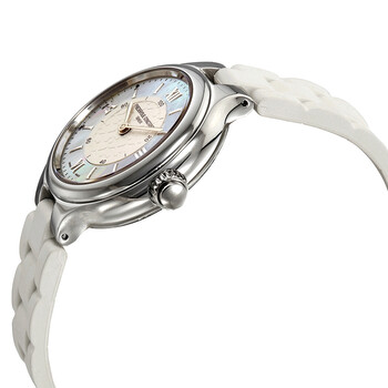 Stainless steel case with a white silicone strap. Fixed stainless steel bezel. Mother of pearl dial with silver-tone sword-shaped hands and index hour markers. Roman numerals appear at the 3, 6, 9 and 12 o'clock positions. Minute markers around the outer rim. Dial Type: Analog. Frederique Constant calibre MMT-281 quartz movement. Scratch resistant sapphire crystal. Solid case back. Round case shape. Case size: 34 mm. Case thickness: 12 mm. Band width: 16 mm. Tang clasp. Water resistant at 30 meters / 100 feet. Functions: hour, minute, sensors, notifications, sleep monitoring, Bluetooth, and alarm. Smart Watch Series. Smart watch style. Watch label: Swiss Made. Frederique Constant Mother of Pearl Dial Ladies Horological Smart Watch FC-281WH3ER6.