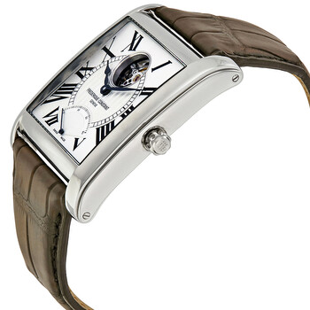 Stainless steel case with a brown leather strap. Fixed stainless steel bezel. Silver dial with Roman numeral hour markers. Minute markers around an inner ring. Dial Type: Analog. Frederique Constant Calibre FC-680 automatic movement with about 42 hours of power reserve. Scratch resistant sapphire crystal. Transparent case back. Case size: 46 mm x 38.5 mm. Case thickness: 11 mm. Rectangle case shape. Water resistant at 30 meters / 100 feet. Functions: hour, minute. Dress watch style. Watch label: Swiss Made. Item Variations: FC 680MS4C26, FC.680MS4C26, FC680MS4C26. Frederique Constant Persuasion Carre Automatic Men's Watch FC-680MS4C26.