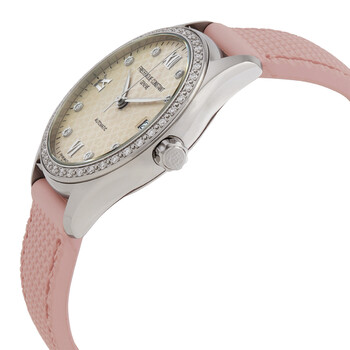 Silver-tone stainless steel case with a pink rubber strap. Fixed silver-tone stainless steel set with diamonds bezel. Silver dial with silver-tone hands and diamond hour markers. Roman numeral marker appears at the 6, 9 and 12 o'clock positions. Minute markers around the outer rim. Dial Type: Analog. Date display at the 3 o'clock position. Frederique Constant Calibre FC-303 Automatic movement, based upon Sellita SW200-1, containing 26 Jewels, bitting at 28800 vph, and has a power reserve of approximately 38 hours. Scratch resistant sapphire crystal. Pull / push crown. Transparent case back. Round case shape, case size: 36 mm, case thickness: 10 mm. Band width: 18 mm. Tang clasp. Water resistant at 50 meters / 165 feet. Functions: date, hour, minute, second. Pink Ribbon Series. Dress watch style. Watch label: Swiss Made. Frederique Constant Pink Ribbon Automatic Diamond Silver Dial Ladies Watch FC-303LGD3BD6-PR.