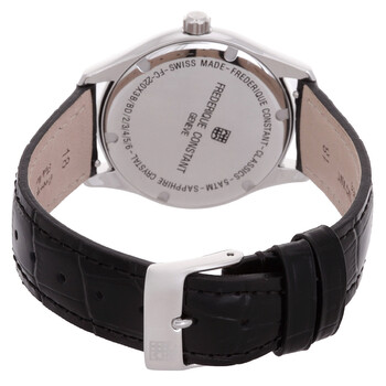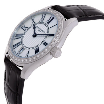 Silver-tone stainless steel case with a black leather strap. Silver-tone diamond set bezel. White dial with black hands and Roman numeral hour markers. Dial Type: Analog. Date display at the 6 o'clock position. Quartz movement. Scratch resistant sapphire crystal. Solid case back. Round case shape, case size: 36 mm. Pin buckle clasp. Water resistant at 30 meters / 100 feet. Functions: date, hour, minute, second. Dress watch style. Watch label: Swiss Made. Frederique Constant Quartz Diamond White Dial Ladies Watch FC-220MPW3BD6.