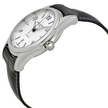 Stainless steel case with a black leather strap. Fixed stainless steel bezel. Silver dial with luminous silver-tone alpha-style hands and alternaing index and Arabic numeral hour markers. Minute markers around the outer rim. Dial Type: Analog. Luminescent hands and markers. Date display at the 6 o'clock position. Frederique Constant calibre FC-303 automatic movement, based upon Sellita SW200-1, containing 26 Jewels, bitting at 28800 vph, and has a power reserve of approximately 38 hours. Scratch resistant sapphire crystal. Screw down crown. Solid case back. Round case shape. Case size: 43 mm. Case thickness: 11 mm. Band width: 18 mm / 23 mm. Deployment with push button release clasp. Water resistant at 50 meters / 165 feet. Functions: date, hour, minute, second. Additional Info: limited to 2888 pieces. suitable for light water contact; unsuitable for diving. Luxury watch style. Watch label: Swiss Made. Frederique Constant Runabout Automatic Men's Watch 303RMS6B6.