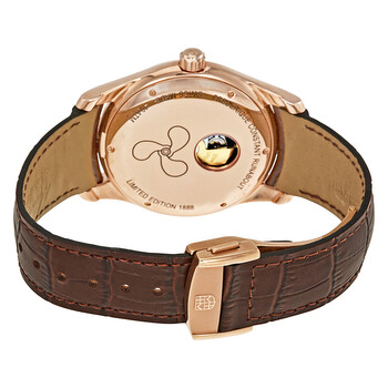 Rose gold-tone stainless steel case with a brown leather strap. Fixed rose gold-tone bezel. Silver dial with luminous rose gold-tone hands and Arabic numeral hour markers. Minute markers around the outer rim. Dial Type: Analog. Date display at the 3 o'clock position. Caliber FC-303 automatic movement with a 42-hour power reserve. Scratch resistant sapphire crystal. Screw down crown. Solid case back with a skeletal window. Case size: 43 mm. Case thickness: 11 mm. Round case shape. Band width: 21.8 mm. Deployment clasp with a push button release. Water resistant at 100 meters / 330 feet. Functions: date, hour, minute, second. Luxury watch style. Watch label: Swiss Made. Frederique Constant Runabout Automatic Men's Watch FC-303RM6B4.