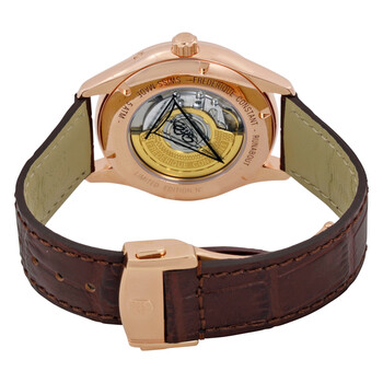 Rose gold-tone stainless steel case with a brown leather strap. Fixed rose gold-tone stainless steel bezel. Silver dial with rose gold-tone alpha-style shape hands and index and Arabic numeral hour markers. Minute markers around the outer rim. Dial Type: Analog. Luminescent hands. Full calendar. Four sub-dials displaying: date, day of the week, month and moonphase. Frederique Constant Calibre FC-365 Automatic movement, containing 25 Jewels, bitting at 28800 vph, and has a power reserve of approximately 42 hours. Scratch resistant sapphire crystal. Pull / push crown. Transparent see through case back. Round case shape, case size: 40 mm, case thickness: 11.2 mm. Band length: 7.5 inches. Fold over with safety release clasp. Water resistant at 50 meters / 165 feet. Functions: full calendar, moon phase, month, date, day, hour, minute, second. Additional Info: limited edition of 2888 pieces. Runabout Moonphase Series. Luxury watch style. Watch label: Swiss Made. Item Variations: FC 365RM5B4, FC.365RM5B4, FC365RM5B4. Frederique Constant Runabout Automatic Men's Watch FC-365RM5B4.