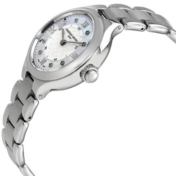 Stainless steel case with a stainless steel bracelet. Fixed stainless steel bezel. Silver dial with silver-tone hands and diamond hour markers. Roman numerals mark the 3, 6, 9 and 12 o'clock position. Minute markers around the outer rim. Dial Type: Analog. Frederique Constant calibre MMT-281 quartz movement. Scratch resistant sapphire crystal. Solid case back. Round case shape. Case size: 34 mm. Case thickness: 11.04 mm. Fold over clasp. Water resistant at 30 meters / 100 feet. Functions: hour, minute, activity tracker, active alerts, dynamic coach, sleep monitoring, smart alarm, worldtimer, notifications, cloud storage. Dress watch style. Watch label: Swiss Made. Frederique Constant Silver Dial Ladies Horological Smartwatch FC-281WHD3ER6B.
