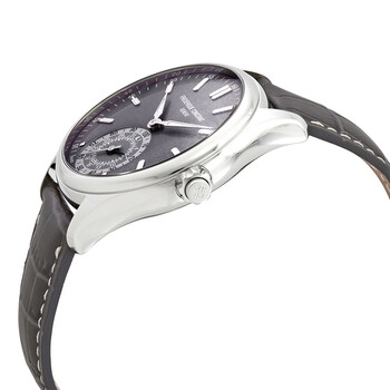 Silver-tone stainless steel case with a grey (calfskin) leather strap. Fixed silver-tone stainless steel bezel. Light grey dial with luminous silver-tone alpha-style hands and index hour markers. Minute markers around the outer rim. Dial Type: Analog. Luminescent hands and markers. Date and 1/100th of a second subdials. Frederique Constant Calibre MMT-285 quartz movement. Scratch resistant convex sapphire crystal crystal. Solid case back. Round case shape, case size: 42 mm, case thickness: 13 mm. Band width: 18 mm. Fold over clasp with a push button release. Water resistant at 50 meters / 165 feet. Functions: date, hour, minute, second. Horological Series. Smart watch style. Watch label: Swiss Made. Frederique Constant Silver Dial Men's Horological Smartwatch FC-285LGS5B6.