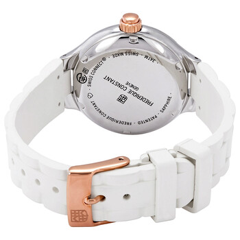 Stainless steel case with a white rubber strap. Fixed rose gold-tone bezel. Mother of pearl (silver center) dial with rose gold-tone hands and index hour markers. Roman numerals appear at the 3, 6, 9 and 12 o'clock positions. Minute markers around the outer rim. Dial Type: Analog. Frederique Constant calibre MMT-281 quartz movement. Scratch resistant convex sapphire crystal. Pull / push crown. Solid case back. Round case shape. Case size: 34 mm. Case thickness: 11 mm. Band width: 16 mm. Tang clasp. Water resistant at 30 meters / 100 feet. Functions: hour, minute, call and email notifications. Smart Watch Series. Smart watch style. Watch label: Swiss Made. Frederique Constant Silver Mother of Pearl Dial Ladies Horological Smartwatch FC-281WH3ER2.