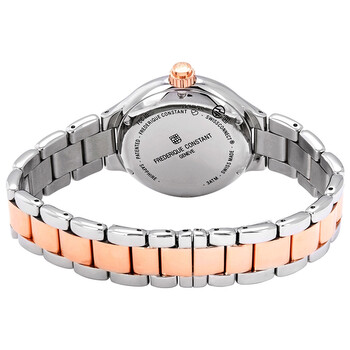 Stainless steel case with a two-tone (silver-tone and rose gold-plated) stainless steel bracelet. Fixed rose gold-plated bezel set with diamonds. Silver mother of pearl dial with rose gold-tone hands and diamond hour markers. Roman numerals mark the 3, 6, 9 and 12 o'clock positions. 1/100th second markers. Minute markers around the outer rim. Dial Type: Analog. Frederique Constant calibre MMT-281 quartz movement. Scratch resistant sapphire crystal. Pull / push crown. Solid case back. Round case shape. Case size: 34 mm. Case thickness: 12 mm. Band width: 16 mm. Butterfly clasp. Water resistant at 30 meters / 100 feet. Functions: hour, minute, call/ text notifications, sleep monitoring, activity tracking, and active alerts. Dress watch style. Watch label: Swiss Made. Frederique Constant Silver Mother of Pearl Dial Ladies Steel and 18k Rose Gold Horological Smartwatch FC-281WHD3ERD2B.