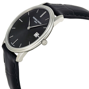 Stainless steel case with a black leather strap. Fixed stainless steel bezel. Black sunray dial with silver-tone leaf-style hands and index hour markers. Dial Type: Analog. Date display at the 3 o'clock position. Frederique Constant calibre FC-220 quartz movement. Scratch resistant sapphire crystal. Pull / push crown. Solid case back. Round case shape. Case size: 37 mm. Case thickness: 6 mm. Band width: 20 mm. Tang clasp. Water resistant at 30 meters / 100 feet. Functions: date, hour, minute. Casual watch style. Watch label: Swiss Made. Item Variations: FC 220NG4S6, FC.220NG4S6, FC220NG4S6. Frederique Constant Slim Line Black Sunray Men's Watch FC-220NG4S6.