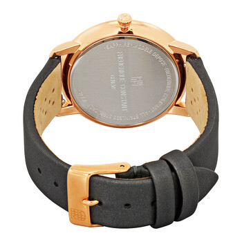Rose gold PVD stainless steel case with a dark grey satin (leather backed) strap. Fixed rose gold PVD bezel set with diamonds. Dark grey dial with rose gold-tone hands and diamond hour markers. A Roman numeral appears at the 12 o'clock position. Dial Type: Analog. Date display at the 6 o'clock position. Frederique Constant calibre FC-220 quartz movement. Scratch resistant sapphire crystal. Pull / push crown. Solid case back. Round case shape. Case size: 37 mm. Case thickness: 6 mm. Band width: 18 mm, band length: 7 inches. Tang clasp. Water resistant at 30 meters / 100 feet. Functions: date, hour, minute. Dress watch style. Watch label: Swiss Made. Item Variations: FC 220G4SD34, FC.220G4SD34, FC220G4SD34. Frederique Constant Slim Line Joaillerie Dark Grey Dial Ladies Watch FC-220G4SD34.