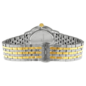 Yellow gold-plated stainless steel case with a two-tone (silver-tone and yellow gold-plated) stainless steel bracelet. Fixed yellow gold-plated bezel. Silver dial with yellow gold-tone leaf-style shape hands and index hour markers. Dial Type: Analog. Frederique Constant calibre FC-200 quartz movement. Scratch resistant sapphire crystal. Pull / push crown. Solid case back. Round case shape. Case size: 29 mm. Case thickness: 5.3 mm. Band width: 14 mm. Band length: 7 inches. Deployment clasp. Water resistant at 30 meters / 100 feet. Functions: hour, minute. Casual watch style. Watch label: Swiss Made. Item Variations: FC 200S1S33B, FC.200S1S33B, FC200S1S33B. Frederique Constant Slim Line Ladies Watch FC-200S1S33B.