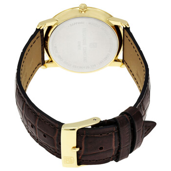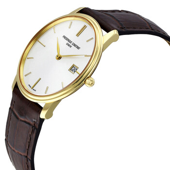 Yellow gold-plated stainless steel case with a brown leather strap. Fixed yellow gold-plated bezel. Light grey dial with yellow gold-tone leaf-style hands and index hour markers. Dial Type: Analog. Date display at the 3 o'clock position. Frederique Constant calibre FC-220 quartz movement. Scratch resistant sapphire crystal. Pull / push crown. Solid case back. Round case shape. Case size: 37 mm. Case thickness: 5.8 mm. Band width: 20 mm. Tang clasp. Water resistant at 30 meters / 100 feet. Functions: date, hour, minute. Casual watch style. Watch label: Swiss Made. Item Variations: FC 220NV4S5, FC.220NV4S5, FC220NV4S5. Frederique Constant Slim Line Light Grey Dial Men's Watch Fc-220nv4s5.