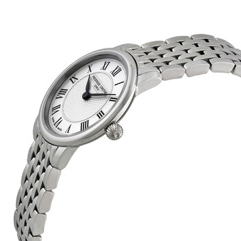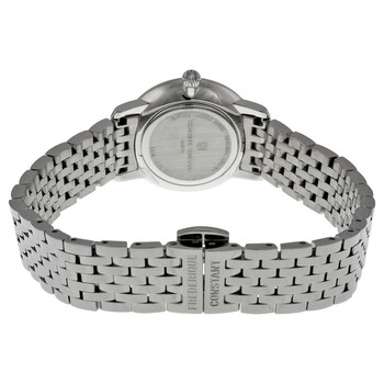 Stainless steel case and bracelet. Fixed stainless steel bezel. Silver dial with black hands and Roman numeral hour markers. Dial Type: Analog. Quartz movement. Scratch resistant sapphire crystal. Solid case back. Case diameter: 25 mm. Case thickness: 5.32 mm. Round case shape. Bracelet width: 12 mm. Fold over clasp. Water resistant at 30 meters / 100 feet. Functions: hour, minute. Dress watch style. Watch label: Swiss Made. Frederique Constant Slim Line Mini Ladies Watch 200MCS6B