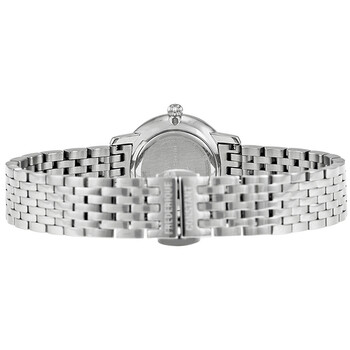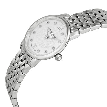 Silver-tone stainless steel case with a silver-tone stainless steel bracelet. Fixed silver-tone stainless steel bezel. Silver guilloche dial with silver-tone spade-shaped hands and diamond hour markers. Roman numerals mark the 6 and 12 o'clock positions. Dial Type: Analog. Frederique Constant Calibre FC-200 quartz movement. Scratch resistant sapphire crystal. Solid case back. Round case shape, case size: 25 mm, case thickness: 5.3 mm. Water resistant at 30 meters / 100 feet. Functions: hour, minute. Dress watch style. Watch label: Swiss Made. Item Variations: FC 200WHDS6B, FC.200WHDS6B, FC200WHDS6B. Frederique Constant Slim Line Mini Silver Dial Stainless Steel Watch FC-200WHDS6B.