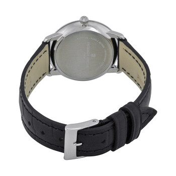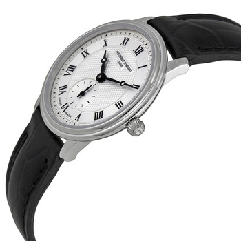 Stainless steel case with a black croco-embossed (calfskin) leather strap. Fixed stainless steel bezel. Silver guilloche dial with black hands and Roman numeral hour markers. Minute markers around the outer rim. Dial Type: Analog. Seconds sub-dial at the 6 o'clock position. Quartz movement. Scratch resistant sapphire crystal. Pull / push crown. Solid case back. Case diameter: 28.6 mm. Case thickness: 5 mm. Round case shape. Band width: 14 mm. Band length: 7 inches. Tang clasp. Water resistant at 30 meters/ 100 feet. Functions: hour, minute, second. Casual watch style. Frederique Constant Slim Line Silver Guilloche Dial Black Leather Ladies Watch 235M1S6.