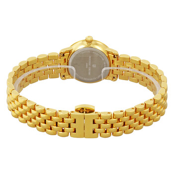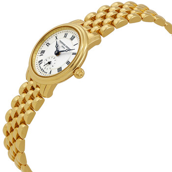 Yellow gold PVD stainless steel case with a yellow gold PVD stainless steel bracelet. Fixed yellow gold PVD bezel. Silver guilloche dial with Roman numeral hour markers. Minute markers around the outer rim. Dial Type: Analog. Small seconds sub-dials. Swiss quartz movement. Scratch resistant sapphire crystal. Pull / push crown. Solid case back. Case size: 23 mm. Round case shape. Deployment clasp. Water resistant at 30 meters / 100 feet. Functions: hour, minute, second. Luxury watch style. Watch label: Swiss Made. Frederique Constant Slim Line Silver Dial Ladies Watch FC-235MS5B.