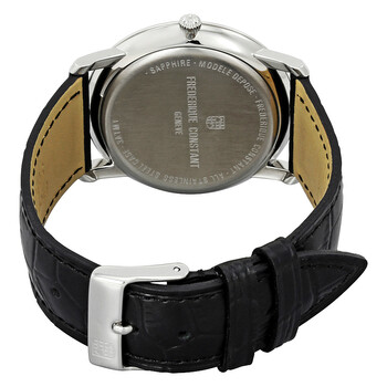 Stainless steel case with a black leather strap. Fixed stainless steel bezel. Silver guilloche dial with blue hands and Roman numeral hour markers. Minute markers. date scale around the inner ring. Dial Type: Analog. Pointer date. Quartz movement. Scratch resistant sapphire crystal. Solid case back. Case size: 39 mm. Round case shape. Tang clasp. Water resistant at 30 meters / 100 feet. Functions: date, hour, minute. Dress watch style. Watch label: Swiss Made. Frederique Constant Slim Line Silver Dial Men's Watch FC-250M5S6.