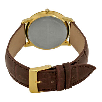 Gold-plated stainless steel case with a brown leather strap. Fixed gold-plated bezel. Silver guilloche dial with black hands and Arabic numeral hour markers. Minute markers around the outer rim. Dial Type: Analog. Date display appears at the 3 o'clock position. Small seconds sub-dial at the 6 o'clock position. Quartz movement. Scratch resistant sapphire crystal. Solid case back. Case diameter: 37 mm. Case thickness: 5 mm. Round case shape. Band width: 20 mm. Tang clasp. Water resistant at 30 meters / 100 feet. Functions: date, hour, minute, second. Casual watch style. Watch label: Swiss Made. Frederique Constant Slim Line Silver Guilloche Gold-Plated Men's Watch 245AS4S5.