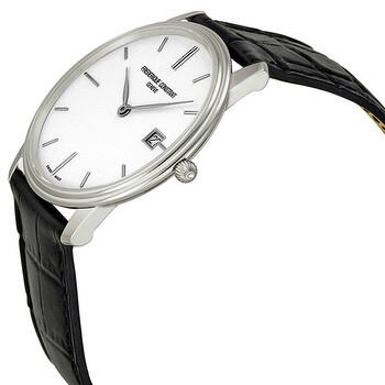 Stainless steel case with a black (calfskin) leather strap. Fixed stainless steel bezel. White dial with silver-tone hands and index hour markers. Dial Type: Analog. Date display at the 3 o'clock position. Quartz movement. Scratch resistant sapphire crystal. Pull / push crown. Solid case back. Case diameter: 37 mm. Case thickness: 5 mm. Round case shape. Tang clasp. Water resistant at 50 meters / 165 feet. Functions: date, hour, minute. Dress watch style. Watch label: Swiss Made. Frederique Constant Slim Line White Dial Unisex Watch FC-220NW4S6.