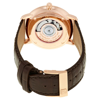 Rose gold-plated stainless steel case with a brown leather strap. Fixed rose gold-plated stainless steel bezel. Silver dial with black leaf-style shape hands and Roman numeral hour markers. Dial Type: Analog. Date display at the 3 o'clock position. Frederique Constant Calibre FC-306 Automatic movement, based upon Sellita SW300-1, containing 25 Jewels, bitting at 28800 vph, and has a power reserve of approximately 42 hours. Scratch resistant mineral crystal. Pull / push crown. Transparent case back. Round case shape, case size: 40 mm, case thickness: 8 mm. Band width: 20 mm, band length: 8 inches. Deployment clasp. Water resistant at 30 meters / 100 feet. Functions: date, hour, minute. Luxury watch style. Watch label: Swiss Made. Frederique Constant Slimline Automatic Silver Dial Men's Watch 306MR4S4.