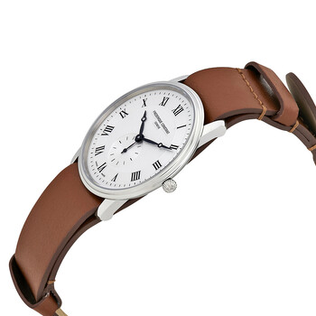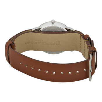 Silver-tone stainless steel case with a brown leather strap. Fixed silver-tone stainless steel bezel. Silver dial with black hands and Roman numeral hour markers. Dial Type: Analog. One- small seconds subdials. Quartz movement. Scratch resistant sapphire crystal. Pull / push crown. Solid case back. Case size: 37 mm. Case thickness: 5 mm. Round case shape. Water resistant at 30 meters / 100 feet. Functions: hour, minute, second. Watch label: Swiss Made. Frederique Constant Slimline Brown Leather Unisex Watch FC-235M4S6-BROWN.