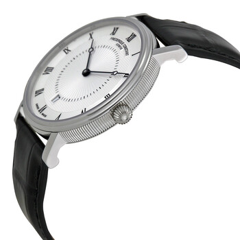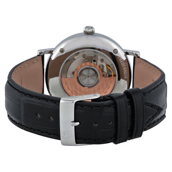 Silver-tone stainless steel case with a black alligator leather strap. Fixed silver-tone stainless steel bezel. Silver guilloche dial with black Breguet-style shape hands and Roman numeral hour markers. Minute markers around the inner ring. Dial Type: Analog. Date display at the 6 o'clock position. Frederique Constant Calibre FC-306 Automatic movement, based upon Sellita SW300-1, containing 25 Jewels, bitting at 28800 vph, and has a power reserve of approximately 42 hours. Scratch resistant sapphire crystal. Pull / push crown. Skeleton case back. Round case shape, case size: 39 mm, case thickness: 7.7 mm. Band width: 20 mm, band length: 8 inches. Tang clasp. Water resistant at 30 meters / 100 feet. Functions: date, hour, minute. Luxury watch style. Watch label: Swiss Made. Item Variations: FC 306MC4S36, FC.306MC4S36, FC306MC4S36. Frederique Constant Slimline Classics Automatic Men's Watch FC-306MC4S36.