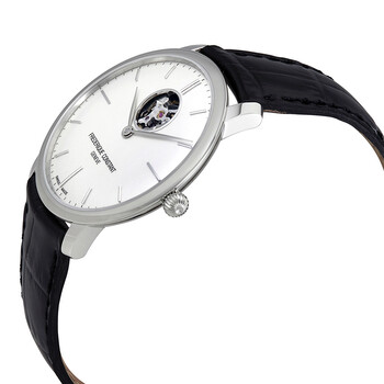 Silver-tone stainless steel case with a black leather with pattern strap. Fixed silver-tone stainless steel bezel. White (open heart) dial with silver-tone leaf-style hands and index hour markers. Minute markers around the outer rim. Dial Type: Analog. Frederique Constant Calibre FC-312 Automatic movement, containing 25 Jewels, bitting at 28800 vph, and has a power reserve of approximately 42 hours. Scratch resistant sapphire crystal. Pull / push crown. Transparent case back. Round case shape, case size: 40 mm, case thickness: 8.3 mm. Band width: 20 mm. Water resistant at 30 meters / 100 feet. Functions: hour, minute. Additional Info: in general, withstands splashes or brief immersion in water, but not suitable for swimming or bathing. Slimline Series. Luxury watch style. Watch label: Swiss Made. Frederique Constant Slimline Heart Beat Automatic Men's Watch 312S4S6.