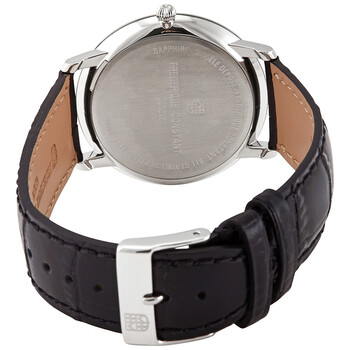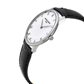 Stainless steel case with a black (crocodile) leather strap. Fixed stainless steel bezel. White dial with silver-tone hands and Roman numeral hour markers. Dial Type: Analog. Frederique Constant calibre FC-200 quartz movement. Scratch resistant sapphire crystal. Pull / push crown. Transparent case back. Round case shape. Case size: 39 mm. Case thickness: 5 mm. Band width: 20 mm. Tang clasp. Water resistant at 30 meters / 100 feet. Functions: hour, minute. Casual watch style. Watch label: Swiss Made. Item Variations: FC 200RS5S36, FC.200RS5S36, FC200RS5S36. Frederique Constant Slimline Midsize Quartz White Dial Men's Watch FC-200RS5S36.