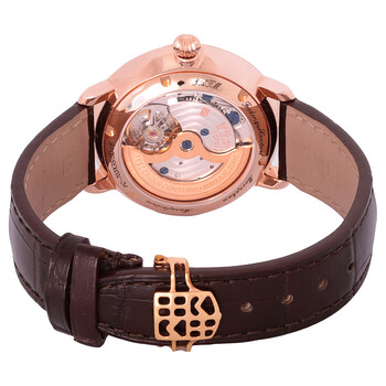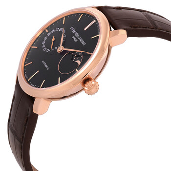 Rose gold-plated stainless steel case with a dark brown alligator leather strap. Fixed stainless steel bezel. Black dial with rose gold-tone hands and index hour markers. Dial Type: Analog. Date display at the 9 o'clock position. Two- date, moonphase subdials. Frederique Constant Calibre FC-702 automatic movement with a 42-hour power reserve. Scratch resistant convex sapphire crystal crystal. Transparent case back. Round case shape. Case size: 38.8 mm. Water resistant at 30 meters / 100 feet. Functions: date, hour, minute, second, moonphase. Watch label: Swiss Made. Frederique Constant Slimline Moonphase Automatic Black Dial Men's Watch FC-702G3S4.