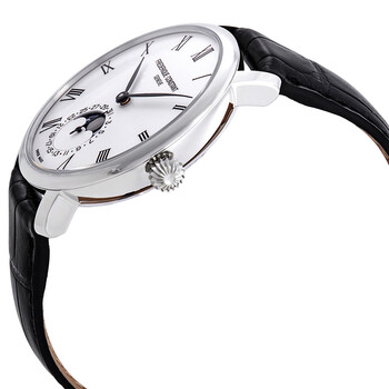 Stainless steel case with a black (alligator) leather strap. Fixed stainless steel bezel. White dial with black leaf-style hands and Roman numeral hour markers. Minute markers around the outer rim. Dial Type: Analog. Date display at the 6 o'clock position. Combination date / moonphase sub-dial. Frederique Constant calibre FC-705 automatic movement, containing 26 Jewels, composed of 145 parts, bitting at 28800 vph, and has a power reserve of approximately 42 hours. Scratch resistant sapphire crystal. Pull / push crown. Transparent case back. Round case shape. Case size: 42 mm. Case thickness: 11 mm. Strap width: 20 mm. Fold over clasp. Water resistant at 30 meters / 100 feet. Functions: moon phase, date, hour, minute. Slimline Moonphase Series. Luxury watch style. Watch label: Swiss Made. Frederique Constant Slimline Moonphase Automatic Men's Watch FC-705WR4S6.