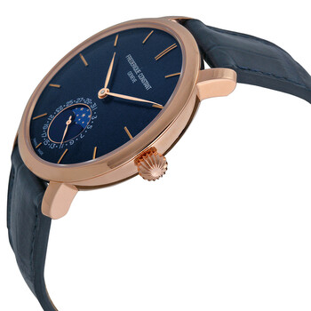 Rose gold-tone stainless steel case with a blue leather strap. Fixed rose gold-tone bezel. Navy blue dial with rose gold-tone hands and index hour markers. Dial Type: Analog. Date and moonphase sub-dial at the 6 o'clock position. Automatic movement. Scratch resistant sapphire crystal. Skeleton case back. Case diameter: 42 mm. Case thickness: 11.7 mm. Round case shape. Tang clasp. Water resistant at 50 meters / 165 feet. Functions: date, hour, minute,monnphase. Luxury watch style. Watch label: Swiss Made. Frederique Constant Slimline Moonphase Automatic Navy Blue Dial Blue Leather Men's Watch FC-705N4S4NN.