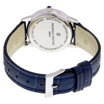 Stainless steel case with a shiny blue (calfskin) leather strap. Fixed stainless steel bezel. Mother of pearl dial with silver-tone leaf-style hands and diamond hour markers. Index markers at the 3, 6, 9 and 12 o'clock positions. Dial Type: Analog. Moonphase display. Frederique Constant calibre FC-206 quartz movement. Scratch resistant sapphire crystal. Pull / push crown. Solid case back. Round case shape. Case size: 30 mm. Case thickness: 7.7 mm. Band width: 12 mm. Band length: 7 inches. Tang clasp. Water resistant at 30 meters / 100 feet. Functions: hour, minute, moonphase. Ultra Slim Series. Dress watch style. Watch label: Swiss Made. Item Variations: FC 206MPWD1S6, FC.206MPWD1S6, FC206MPWD1S6. Frederique Constant Slimline Moonphase Mother of Pearl Dial Diamond Blue Leather Ladies Watch FC-206MPWD1S6.