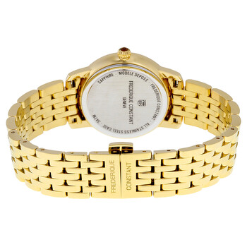 Yellow gold-plated stainless steel case and bracelet. Fixed yellow gold-plated bezel. White mother of pearl dial with gold-tone leaf-style hands and diamond hour markers. Index markers at the 3, 6, 9 and 12 o'clock positions. Dial Type: Analog. Moonphase display. Frederique Constant calibre FC-206 quartz movement. Scratch resistant sapphire crystal. Pull / push crown. Solid case back. Round case shape. Case size: 30 mm. Case thickness: 7.7 mm. Band width: 14 mm. Band length: 7 inches. Fold over clasp with a push button release. Water resistant at 30 meters / 100 feet. Functions: hour, minute, moonphase. Luxury watch style. Watch label: Swiss Made. Item Variations: FC 206MPWD1S5B, FC.206MPWD1S5B, FC206MPWD1S5B. Frederique Constant Slimline Moonphase Mother of Pearl Dial Ladies Watch FC-206MPWD1S5B.