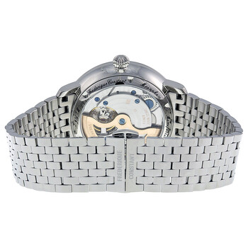 Stainless steel case with a stainless steel bracelet. Fixed stainless steel bezel. Navy blue dial with silver-tone hands and index hour markers. Dial Type: Analog. Date and moonphase sub-dial at the 6 o'clock position. Automatic movement with a 42 hour power reserve. Scratch resistant sapphire crystal. Pull / push crown. Skeleton case back. Case diameter: 42 mm. Round case shape. Band width: 20 mm. Fold over with safety release clasp. Water resistant at 50 meters / 165 feet. Functions: date, hour, minute, second, moonphase. Luxury watch style. Watch label: Swiss Made. Frederique Constant Slimline Moonphase Navy Blue Dial Steel Men's Watch FC-705N4S6B.