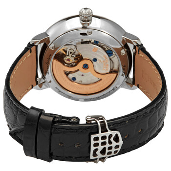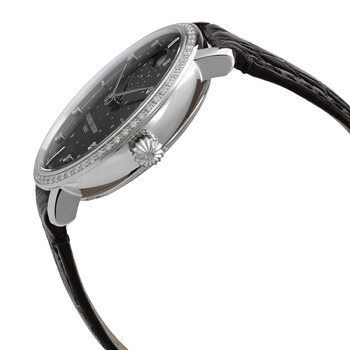 Stainless steel case with a glossy black (alligator) leather strap. Fixed stainless steel bezel set with 60 diamonds. Black dial with silver-tone hands and diamond hour markers. Index markers appear at the 3, 6, 9 and 12 o'clock positions. Dial Type: Analog. Moonphase display. Frederique Constant calibre FC-701 automatic movement with a 38-hour power reserve. Scratch resistant convex sapphire crystal. Pull / push crown. Transparent case back. Round case shape. Case size: 38.8 mm. Fold over clasp. Water resistant at 30 meters / 100 feet. Functions: hour, minute, moonphase. Additional Info: case set with 60 diamonds. Slimline Moonphase Stars Series. Luxury watch style. Watch label: Swiss Made. Frederique Constant Slimline Moonphase Stars Automatic Diamond Black Dial Men's Watch FC-701BSD3SD6.