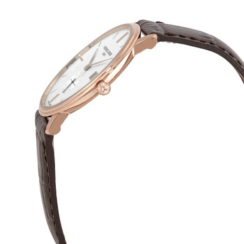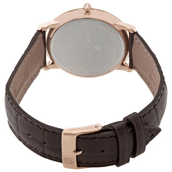 Rose gold PVD stainless steel case with a brown leather strap. Fixed rose gold PVD bezel. Silver dial with rose gold-tone hands and index hour markers. Dial Type: Analog. Date display at the 3 o'clock position. Small seconds sub-dial. Quartz movement. Scratch resistant sapphire crystal. Pull / push crown. Solid case back. Round case shape. Case size: 39 mm. Case thickness: 5 mm. Band width: 20 mm. Tang clasp. Water resistant at 30 meters / 100 feet. Functions: date, hour, minute, second. Slimline Series. Dress watch style. Watch label: Swiss Made. Frederique Constant Slimline Quartz Silver Dial Men's Watch FC-245V5S4.