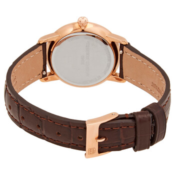 Rose gold-tone stainless steel case with a brown leather strap. Fixed rose gold-tone bezel. White dial with rose gold-tone hands and index hour markers. Dial Type: Analog. Frederique Constant Calibre FC-200 quartz movement. Scratch resistant sapphire crystal. Pull / push crown. Solid case back. Round case shape. Case size: 29 mm. Case thickness: 5 mm. Band width: 14 mm. Tang clasp. Water resistant at 30 meters / 100 feet. Functions: hour, minute. Slimline Series. Dress watch style. Watch label: Swiss Made. Frederique Constant Slimline Quartz White Dial Ladies Watch FC-200V1S34.