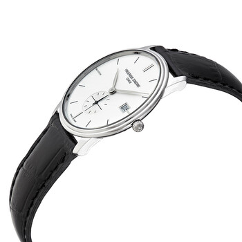 Stainless steel case with a black leather strap. Fixed stainless steel bezel. White dial with silver-tone leaf-style s hands and index hour markers. Dial Type: Analog. Date display at the 3 o'clock position. One subdial displaying: small seconds. Frederique Constant Calibre FC-245 quartz movement. Scratch resistant sapphire crystal. Screw down crown. Solid case back. Round case shape, case size: 37 mm, case thickness: 5 mm. Band width: 18 mm. Tang clasp. Water resistant at 30 meters / 100 feet. Functions: date, hour, minute, small second. Slimline Series. Casual watch style. Watch label: Swiss Made. Frederique Constant Slimline Quartz White Dial Men's Watch FC-245S4S6.