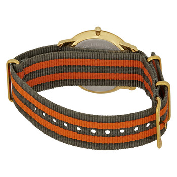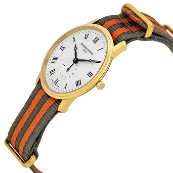 Yellow gold-tone stainless steel case with a grey and orange stripe nylon strap. Fixed yellow gold-tone bezel. Silver dial with black hands and Roman numeral hour markers. Minute markers around the outer rim. Dial Type: Analog. Small seconds sub-dial above the 6 o'clock position. Frederique Constant calibre FC-235 quartz movement. Scratch resistant sapphire crystal. Pull / push crown. Solid case back. Round case shape, case size: 37 mm, case thickness: 5 mm. Band width: 20 mm. Tang clasp. Water resistant at 30 meters / 100 feet. Functions: hour, minute, second. Casual watch style. Watch label: Swiss Made. Item Variations: frederique-constant-watch-fc-235m4s5-gr-orange. Frederique Constant Slimline Unisex Two Tone Watch FC-235M4S5-GR-ORANGE.