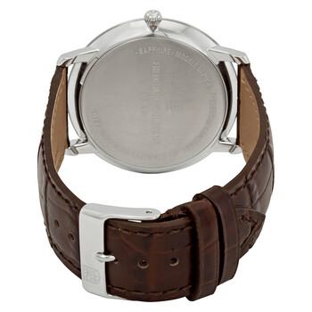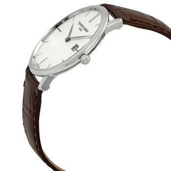 Stainless steel case with a brown leather strap. Fixed stainless steel bezel. White dial with silver-tone hands and index hour markers. Dial Type: Analog. Date display at the 3 o'clock position. Quartz movement. Scratch resistant sapphire crystal. Pull / push crown. Solid case back. Round case shape. Case size: 39 mm. Case thickness: 6 mm. Band width: 20 mm. Tang clasp. Water resistant at 30 meters / 100 feet. Functions: date, hour, minute. Dress watch style. Watch label: Swiss Made. Frederique Constant Slimline White Dial Men's Watch FC-220BRS5S6.